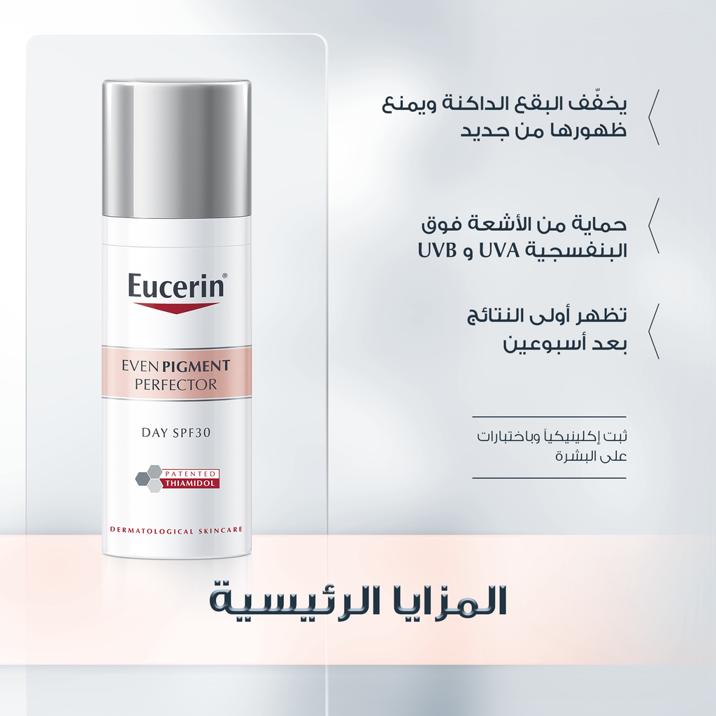كريم يوسيرين إيفن بيجمنت بيرفيكتور النهاري بعامل حماية من الشمس 30، 50 مل، يحتوي على الثياميدول، وهو مكون فعال وحاصل على براءة اختراع، يعمل على علاج السبب الجذري لفرط التصبغ عن طريق تقليل إنتاج الميلانين. وقد ثبت سريريًا وجلديًا قدرته على تقليل البقع الداكنة ومنع ظهورها مجددًا. تظهر النتائج الأولى بعد أسبوعين، وتتحسن باستمرار مع الاستخدام المنتظم.