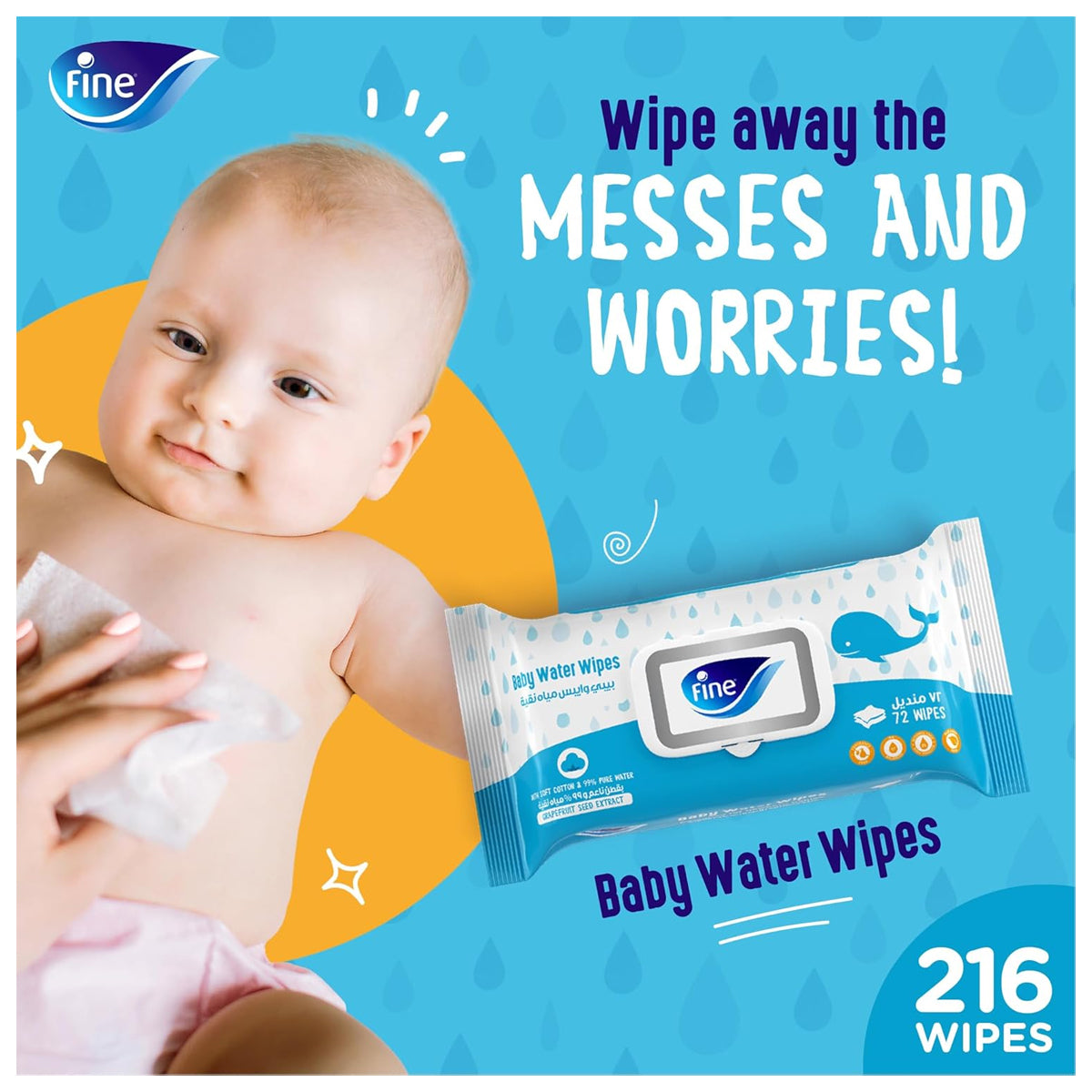 -   مجموعة مريحة مكونة من 72 قطعة: مناديل فاين بيبي المائية متوفرة في عبوات من 72 قطعة، مما يجعلها سهلة التخزين وفي متناول يديكِ دائمًا. سواء كنتِ في المنزل أو أثناء التنقل، سيكون لديكِ الخيار الأمثل للحفاظ على نظافة طفلكِ وراحته.