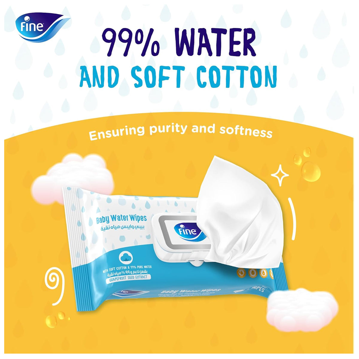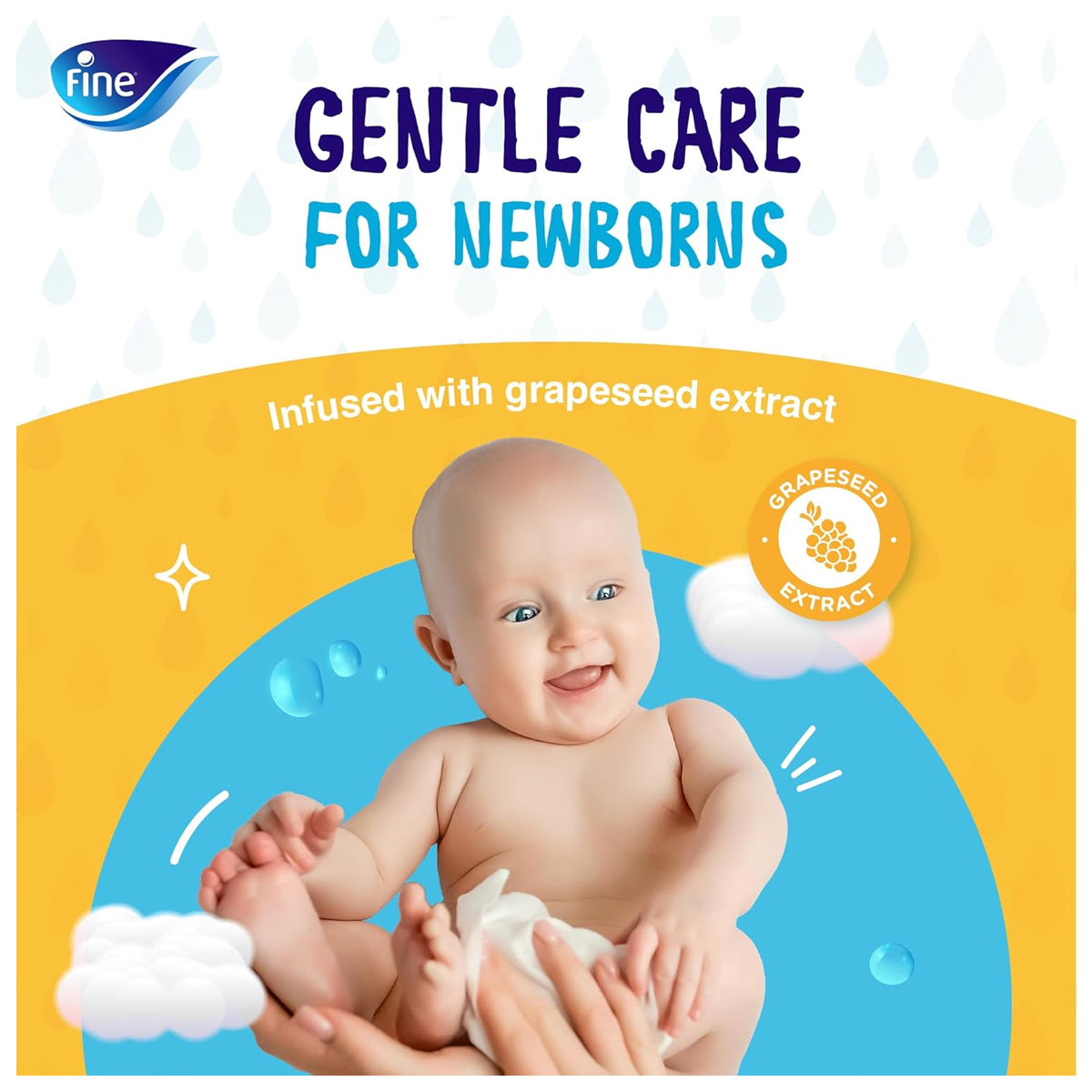 -   العناية اللطيفة بالمواليد الجدد: مناديل فاين بيبي المائية مصممة بعناية فائقة لحديثي الولادة، لتوفر عناية لطيفة لبشرتهم الحساسة. غنية بمستخلص بذور العنب، توفر هذه المناديل ترطيبًا طبيعيًا، وتحافظ على بشرة طفلك ناعمة وصحية.