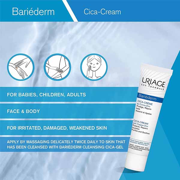 ضعي كريم يورياج باريديرم سيكا المُرمّم بالنحاس والزنك على بشرة نظيفة وجافة. يُمكن استخدامه على الوجه والجسم.
