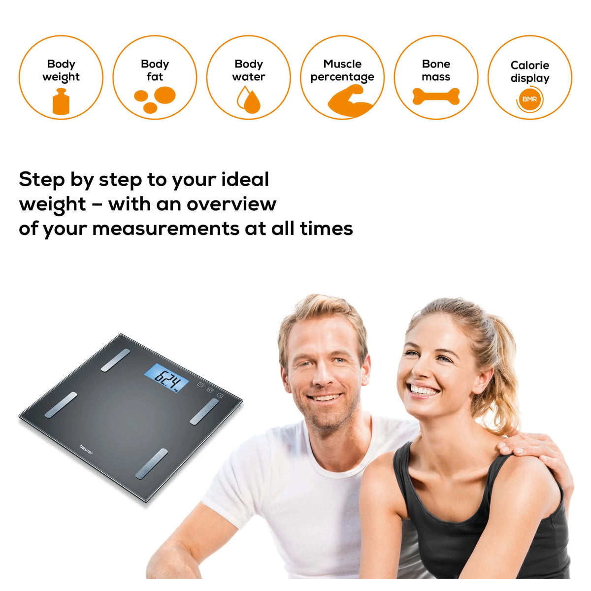 - Weight, body fat, body water, muscle percentage, bone mass and BMR calorie display