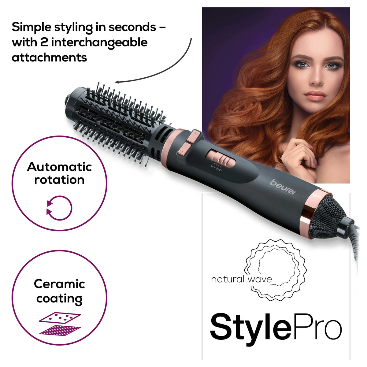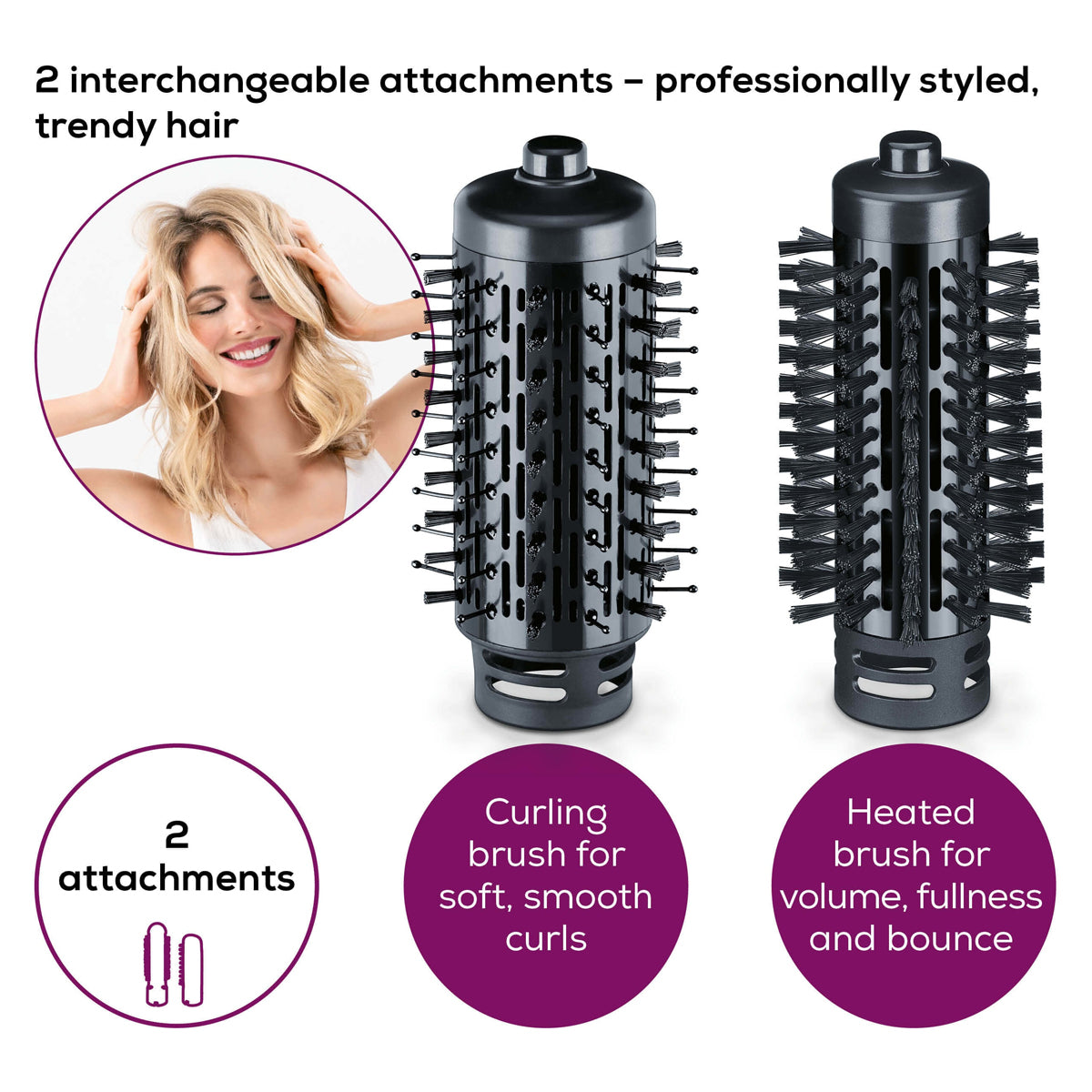 Beurer Roating Hot Air Brush - HT 80 with 2 interchangeable attachments for simple styling in seconds the heated brush allows you to create a hairstyle with volume, body and bounce, and the curling brush helps you to conjure up soft and sleek curls and waves.