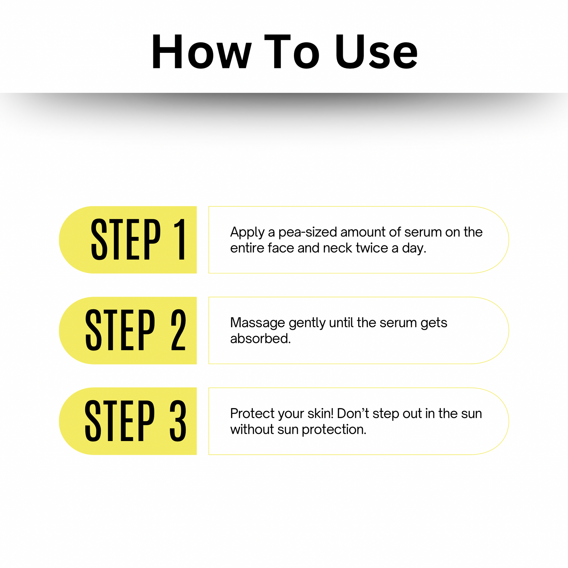 Apply a pea-sized amount of serum on the entire face and neck twice a day