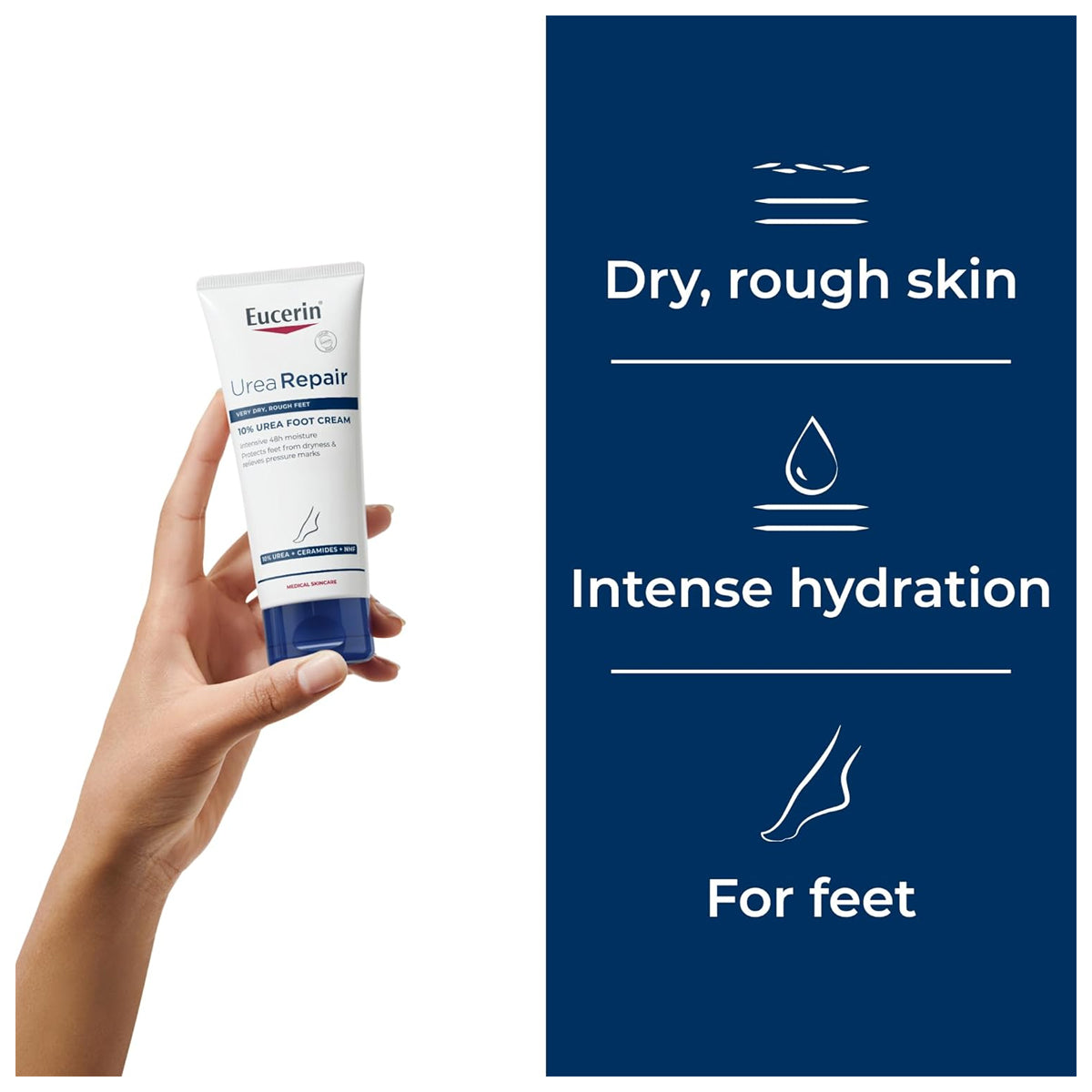 Eucerin Urea Repair Plus 10% Urea Foot Cream 100ml is a repairing foot treatment that provides immediate and comfort to dry and cracked skin. Infused with Urea, Ceramides, and other natural moisturizing factors, this product effectively binds moisture to the skin, all the while restoring the skin's natural protective barrier to prevent further moisture loss. Especially indicated to act on very damaged areas, such as the heels, this formulas softens the skin and offers immediate relief from tightness and itching, delaying these symptoms for up to 48 hours.
