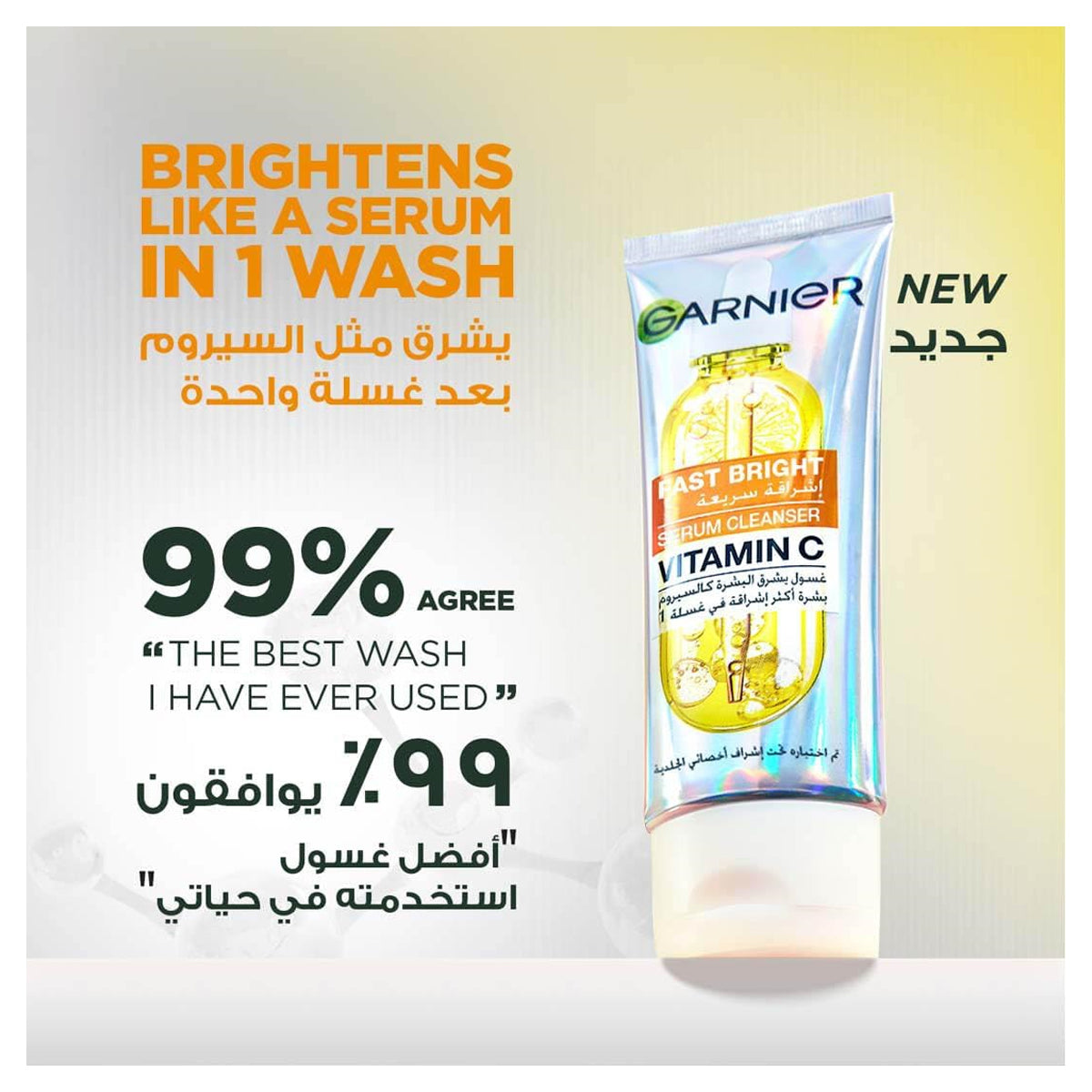 Garnier Skinactive Fast Bright Vitamin C Serum Cleanser Face Wash 100 ml brighter Skin in 1 Wash with One Bottle of Serum in One Face wash! Experience the double power of deep cleansing and instant brightening with Garnier Bright Complete Vitamin C Serum Cleanser. South Asian climates, with their pollution and humidity, can make it tough to maintain a radiant complexion. A simple cleanse isn’t enough! Your quick fix is this Garnier serum cleanser that instantly brightens your skin like a serum to give results in one wash. With its deep cleansing + instant brightening properties, the serum cleanser helps you experience the benefits of two products in a single go. Going deep within the pores, the Bright Complete serum cleanser removes all impurities like pollution and excessive sebum. Packed with antioxidants like vitamin C, the serum cleanser protects your skin against oxidative stress to prevent dark spots. The serum cleanser also helps you beat the tan to reveal a more even-toned, brighter skin.
