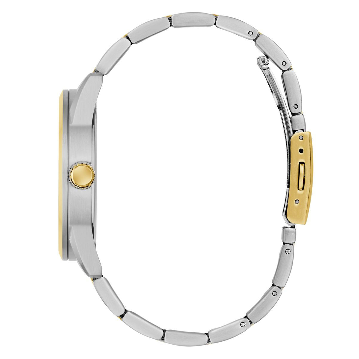 Embrace your outdoorsy side with this clean sport timepiece that combines rugged functionality with refined aesthetics. Featuring a 40 mm round two-tone silver and gold tone brushed and polished recycled steel case and stainless steel bracelet. The honest indigo sunray dial provides crisp, clean readability while the dual finish on both case and bracelet adds sophisticated depth to this athletic-inspired design. Built with precise quartz analog movement, and enhanced 50 meters water resistance, this versatile timepiece is perfect for the man who wants to conquer outdoor adventures without compromising on style.