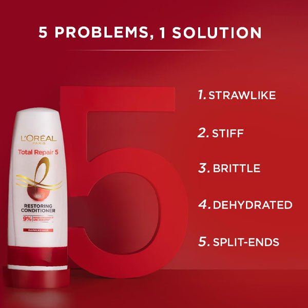 TOTAL REPAIR 5 helps repair 5 signs of damaged hair. From daily brushing or styling, hair can become fine, fragile, dull or rough with split ends. The formula helps repair and restore the 5 visible signs of replenished hair without weighing it down. Hair feels stronger, looks fuller, and looks revitalized and silky with a healthy looking shine.