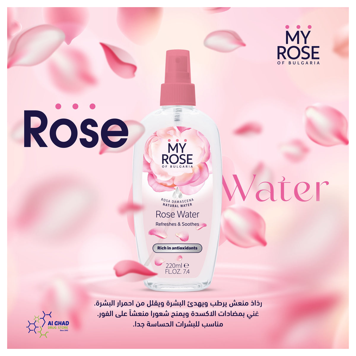 My Rose Rose Water Refreshes & Soothes 220ml our refreshing and soothing spray for the face, décolleté and body, contains natural rose water from the Bulgarian Rosa Damascena, rich in microdroplets of essential oil, which penetrate, moisturize and soothe the skin. Rose water is a rich source of antioxidants that protect the skin from the harmful effects of the environment. Thanks to the captivating scent of the precious rose oil, using this spray is a pleasure. Gives an instantly refreshing feeling of comfort, anywhere and anytime.