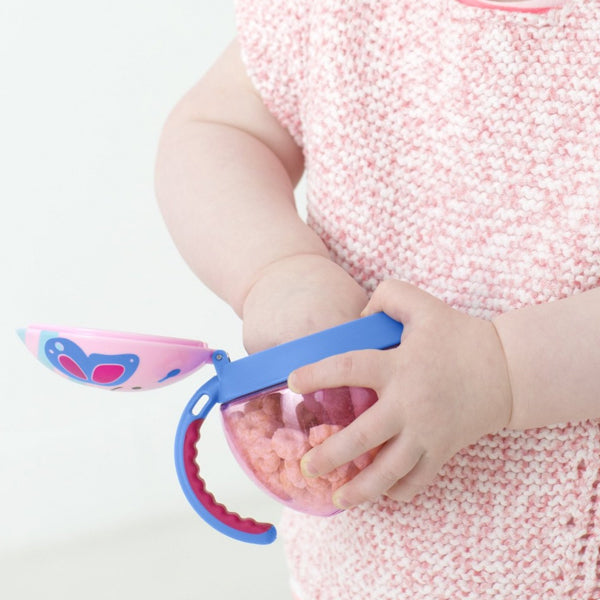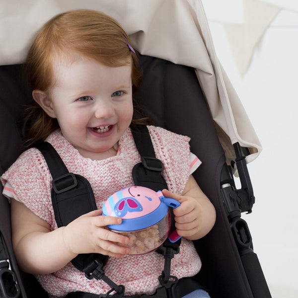 Skip Hop Zoo Snack Cup Butterfly perfect for toting munchies, this cute cup encourages independent snacking without the mess. The easy-grip handle is sized just right for little hands, and the snap top lid ensures food stays fresh. The flexible inside opening keeps snacks from spilling out - even if it's tipped over. With two lids there's less mess and everything stays crumb-free!