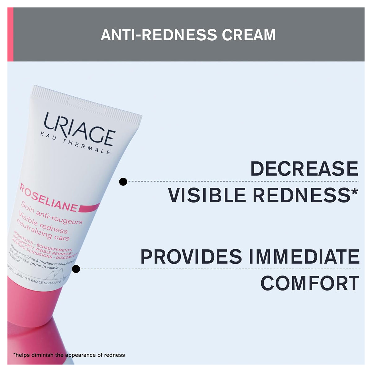 Uriage Roseliane Visible Redness Neutralizing Care Cream 40ml reduces and helps prevent redness. Formulated with key dermatological ingredients - red algae, ceramides and vitamin E - it provides immediate, long-lasting soothing relief from heating and tightness sensations. Effective immediately. The combination of the tlr2-regul complex and the sk5r complex (specific-kallikrein-5-regulator) regulates the activity of kallikrein-5, the protease responsible for inflammation and vascular problems, for a powerful soothing effect. Light texture with neutralizing green pearls. Dermatologically tested on sensitive skin prone to couperosis. Recommended by dermatologists. Visible signs: visible redness, heating sensation, discomfort. Key ingredients: Red Algae + Ceramides + vitamin E. Result: skin is even and moisturized. Immediate comfort.